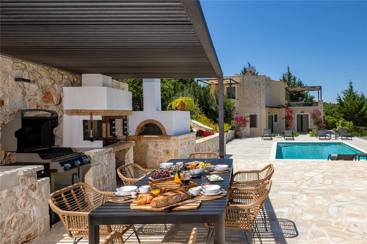 Surrounded by wonderful natural landscape, there are several spaces overlooking the stunning coastline but the villas highlight is its sunset lounge under the pergola by the private pool that features an outdoor kitchen with fire pit, rotisserie, bbq and wood fired pizza oven, perfect for lounging, al fresco dining and taking in the stunning scenery.