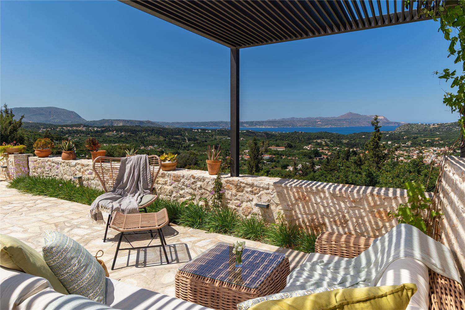 The newly renovated villa is one of three detached villas. From spacious accommodation to high-end amenities there is everything you need to make your stay unforgettable. The villa is built over 2 floors and consists of 3 spacious bedrooms with A/C and direct access to the private pool, 2 bathrooms, fully-equipped kitchen, comfortable living areas with fire place, two terraces and vast outdoor spaces with panoramic sea view over Souda bay, infinity pool, outdoor kitchen, bbq, rotisserie, pizza oven, outdoor lounge with spacious corner sofa facing the sunset, sea and village view.